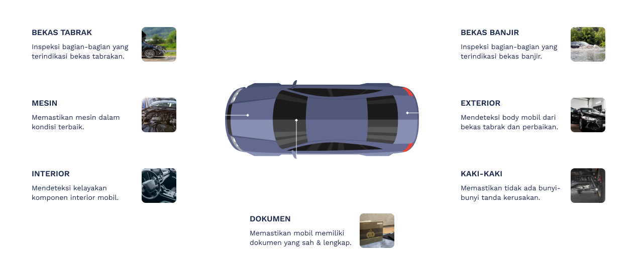 Kami menyediakan layanan inspeksi mobil secara menyeluruh untuk memastikan kondisi kendaraan sebelum Anda membeli.